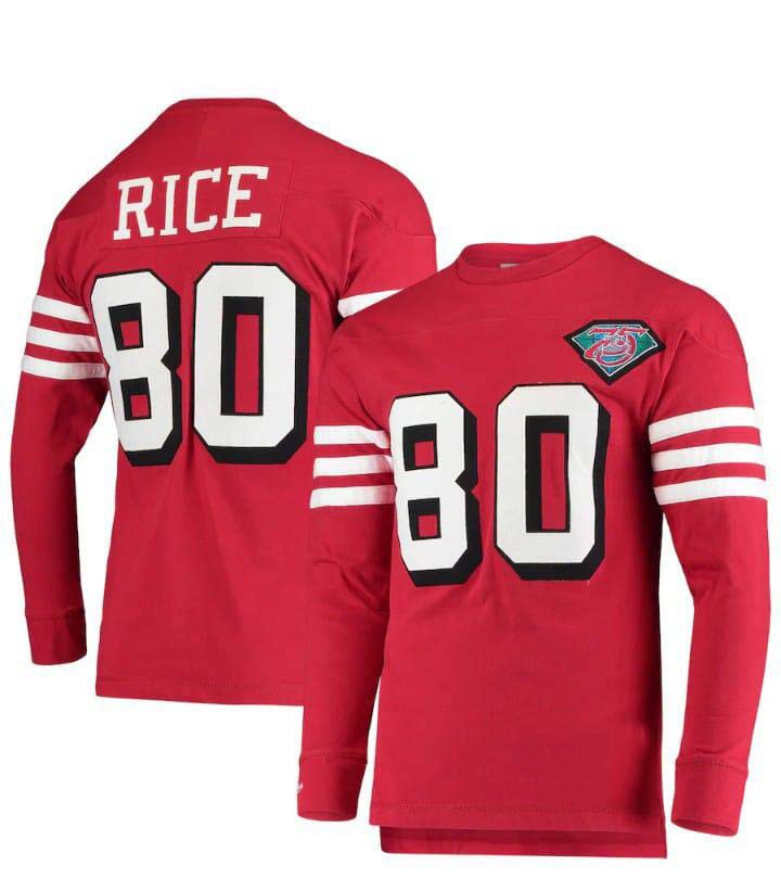 SF.49ers #80 Jerry Rice Mitchell & Ness Throwback Retired Player Name & Number Long Sleeve Top Stitched American Football Jersey